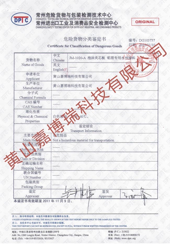 危險(xiǎn)貨物分類鑒定書_JM-1020-A